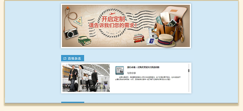 Project Description 百悦逸游于2012年初由二位资深的旅行家创办,是成都传媒集团旗下成都新闻国际旅行社有限公司的高端旅游品牌,总部位于成都高新区天府大道中段美年广场。在百悦逸游成立之前,创始团队亲自到全球三十多个国家实地考察,带着第一手的资讯和执着的信念创立了中国西部第一家真正意义上的私人定制旅行机构。百悦的旅行不是跟团挤大巴,不是十天去十个国家,更不是没完没了的... Official website address 伊犁http://www.100.travel I want to share